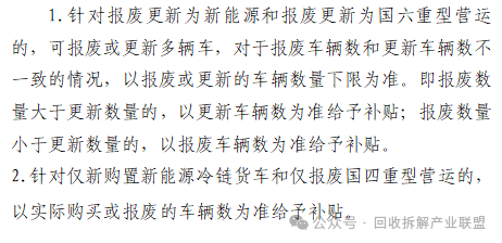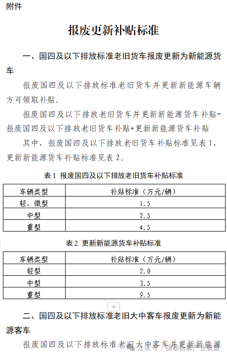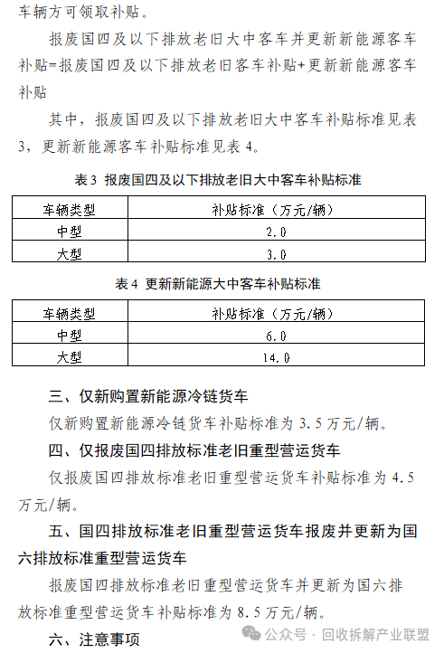 本實施細則對國四及以下排放標準老舊貨車和大中型客車報廢并更新為新能源車輛(以下簡稱“報廢更新為新能源”)的車主,僅新購置新能源冷鏈貨車、僅報廢國四排放標準老舊重型營運貨車(以下簡稱“僅報廢國四重型營運”)、國四排放標準老舊重型營運貨車報廢并更新為國六排放標準重型營運貨車(以下簡稱“報廢更新為國六重型營運”)的業戶給予補貼。
